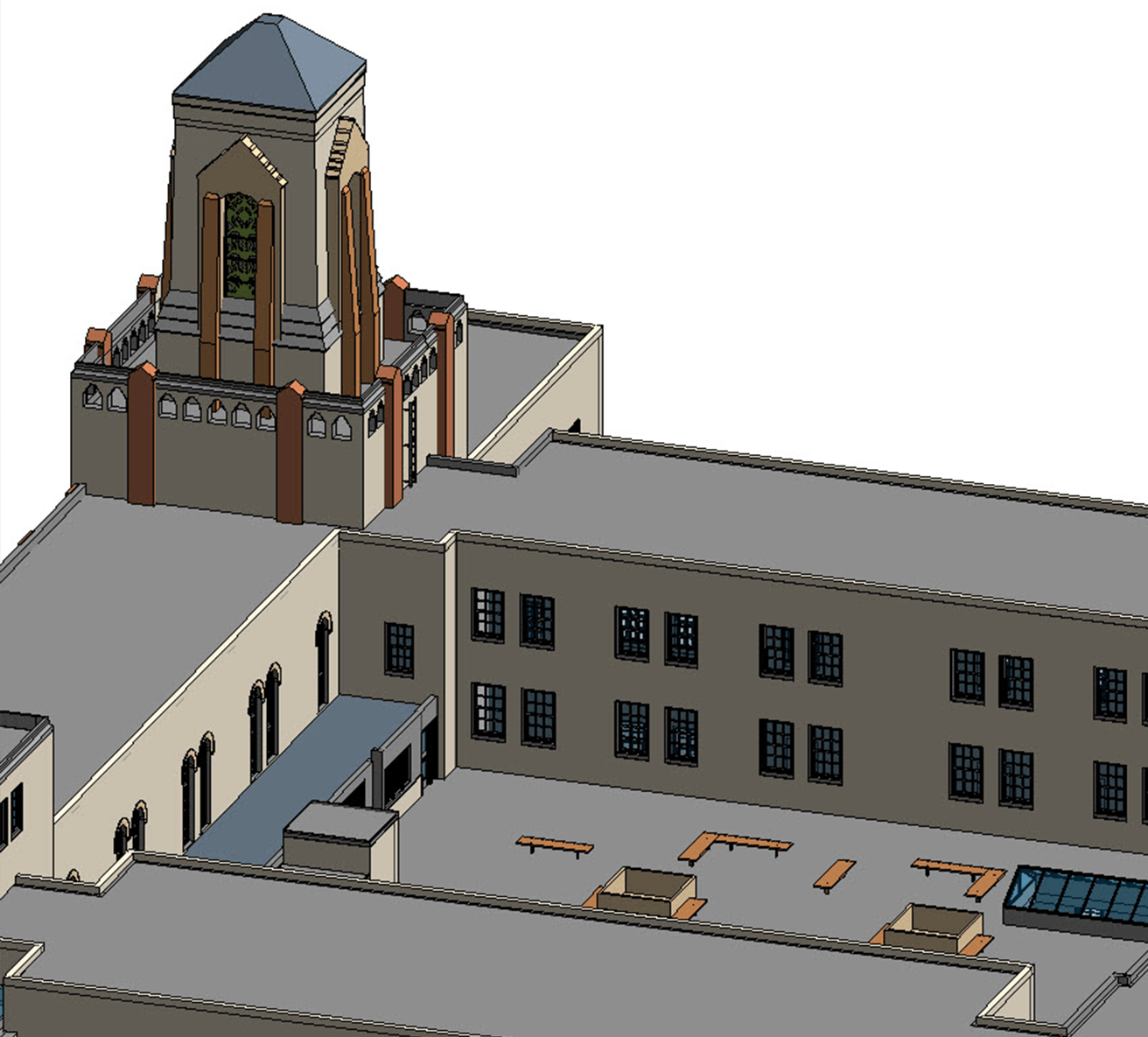 This vacant University building was 3D laser scanned to document the exterior façade, interior courtyard, rooftop and bell tower. The client is repurposing the building, and desires to preserve the architectural details of the exterior. TruePoint engineers utilized the colorized 3D laser scan data to generate a LOD 350 model and 2D AutoCAD elevations with point cloud overlay.
